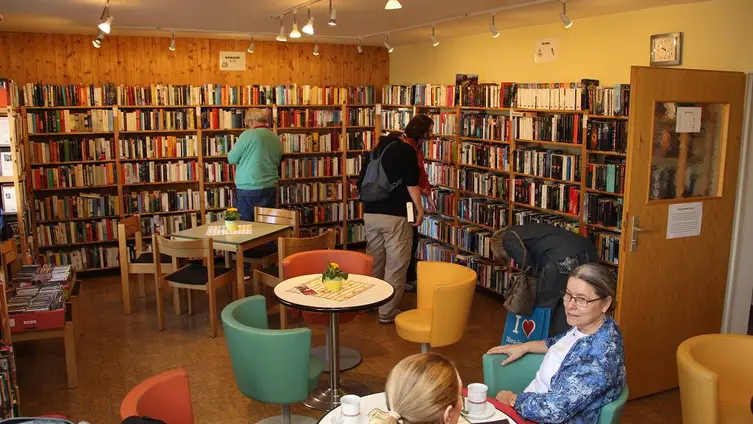 Zwei wunderbare große Räume stehen uns zur Verfügung, wir konnten unser Angebot erweitern und sind endlich auch für gehbehinderte Menschen gut erreichbar. Unser Stammkundenkreis wächst ständig. Die unter-schiedlichsten Menschen besuchen uns, genießen Kaffee, Tee sowie unseren hausgemachten Kuchen in gemütlicher Atmosphäre, stöbern in unserer großen Bücherauswahl und (fast) niemand geht ohne mindestens ein Buch gekauft zu haben.